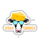 Introducing our newest Stay Cheesy Cow Decal! This playful sticker features a cool cow sporting stylish sunglasses and the catchy phrase 'Stay Cheesy.' Stick it to your laptop, water bottle, or notebook, and you'll be cheesin' for a reason.