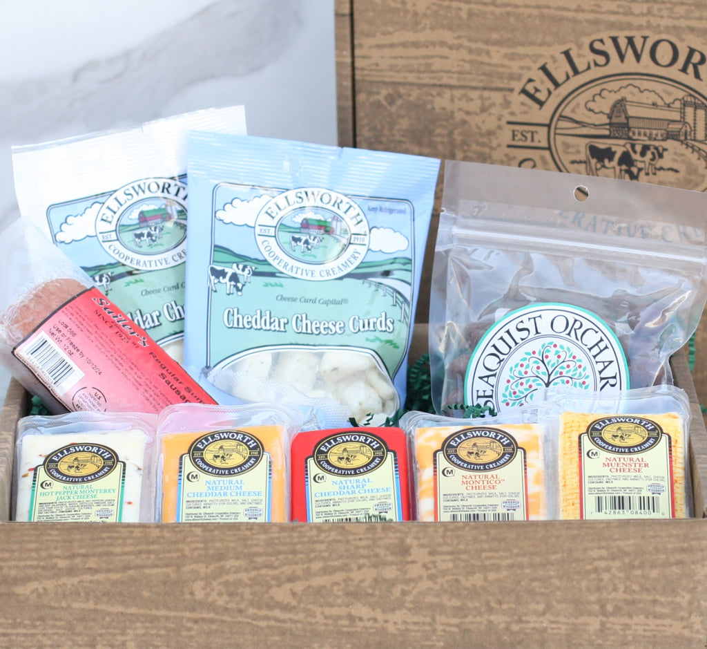 The perfect little sampling of delicious Wisconsin Cheese. Includes 16oz Natural Curds, 7.5oz White Cheddar, 7.5oz Bacon Cheddar, 7.5oz Montico, and Sailer’s Beef Sticks.