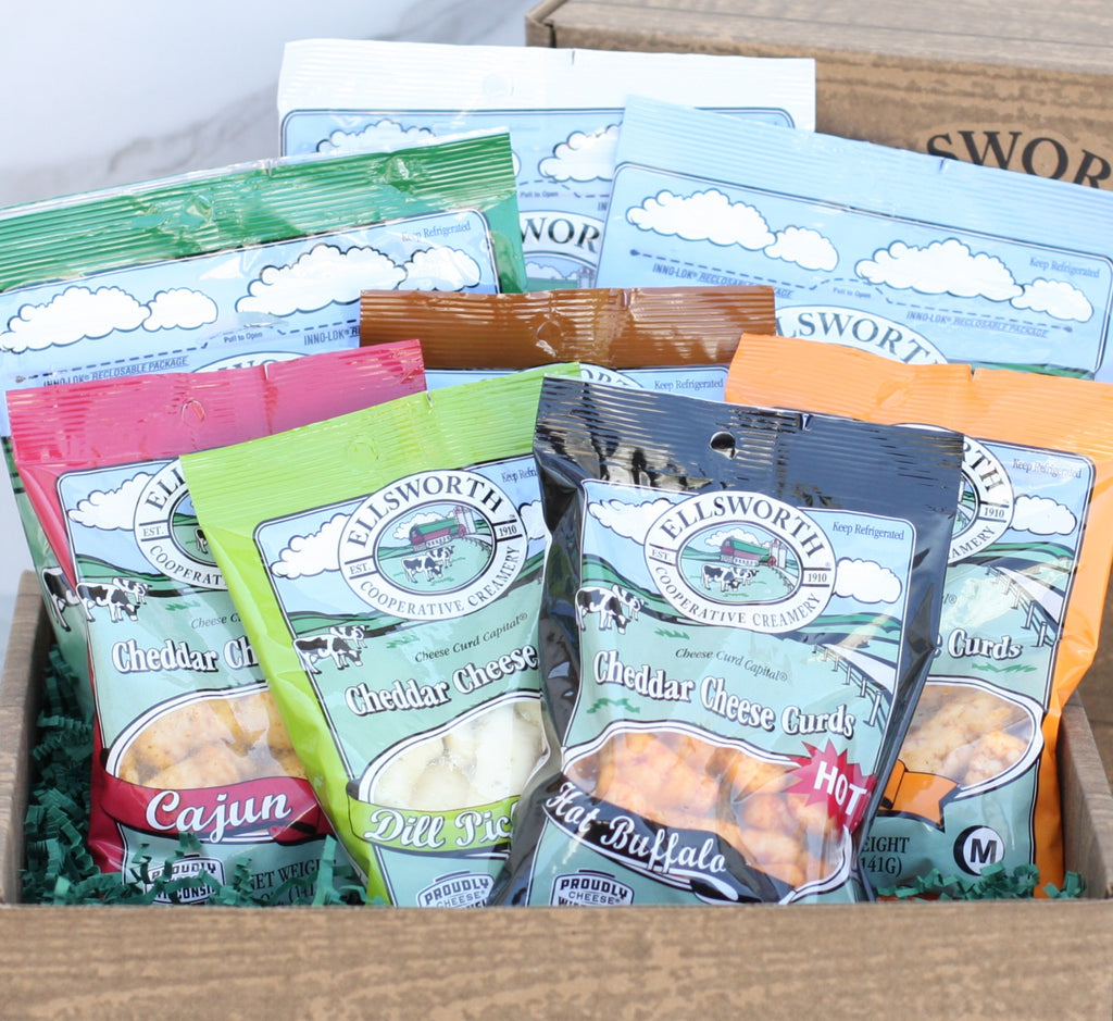 Loved by cheese curd fans everywhere, this box features all of our best-selling cheese curd flavors in one collection! Includes 16oz Natural Curds, 16oz Garlic Curds, 16oz Ranch Curds, 5oz Cajun Curds, 5oz Dill Curds, 5oz Hot B...